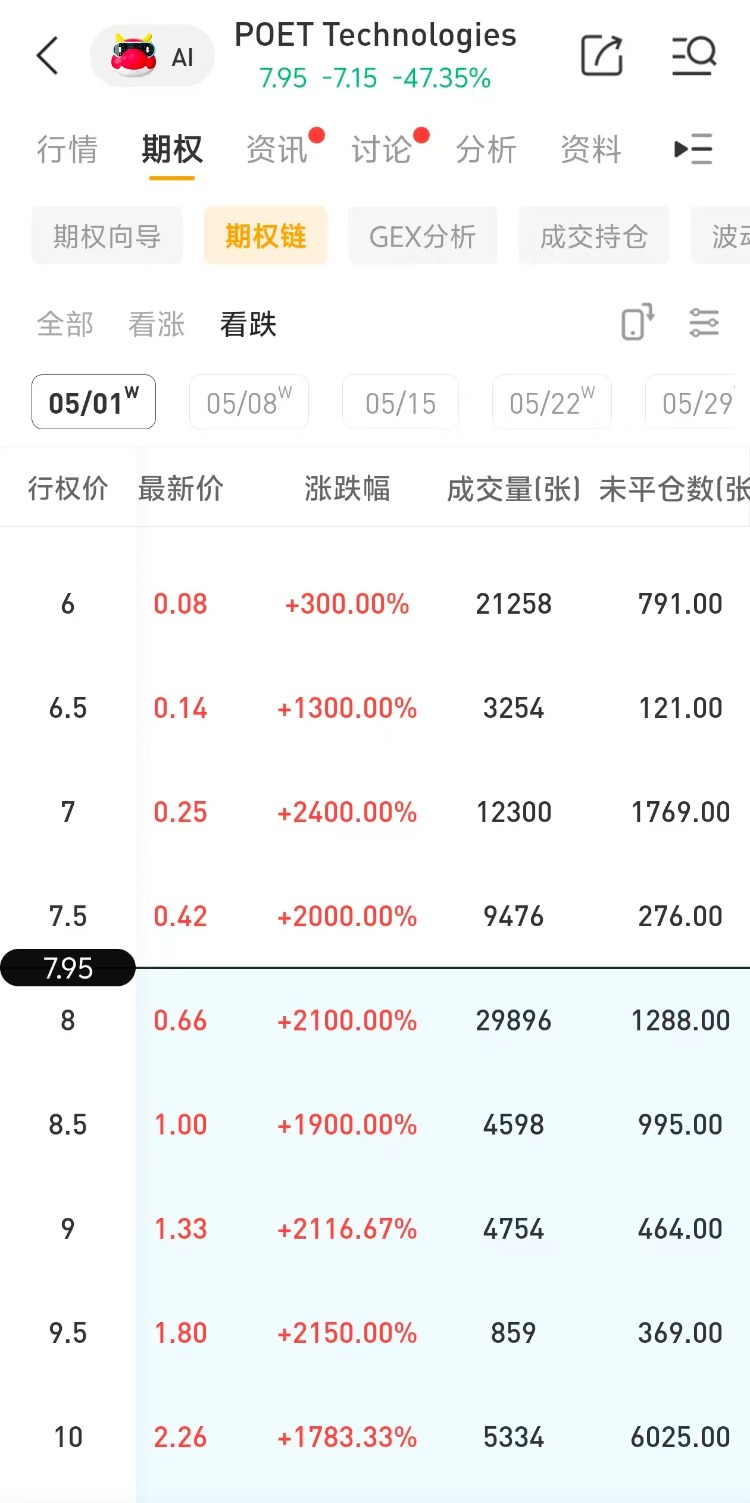 多张看跌期权集体大涨!其中成交量最大的为一看跌期权(POET_260501_P_8.0)交易量达2.99万张,该合约行权价为8.0美元,行权日在2026-05-01,该张期权涨2100.0%。